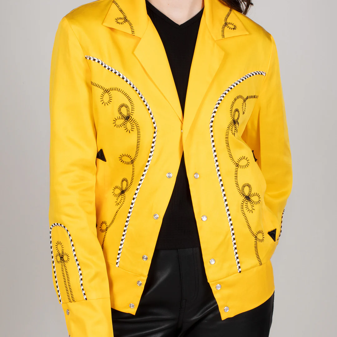 Third Man Records X H Bar C exclusive colourway. Exceptional in so many ways, from the textural chain stitching, appliqued lucky horseshoe and detailed piping of the five button cuff. This stunning jacket was originally designed and created for legendary country singer Bob Wills in 1936. Still fabulous after all these years. A classic. Made in America. Fabric: 100% tencel, it's super soft and lined. If you're curious about sizing, it is fitted. For more room, size up.